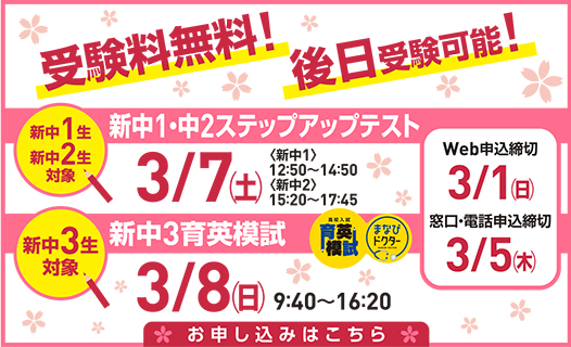 新中1・新中2ステップアップテスト3/7(土)・新中3育英模試3/8(日)