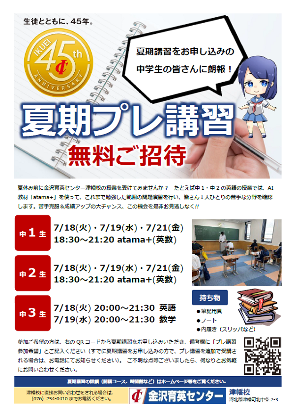夏休み前に金沢育英センター津幡校の授業を受けてみませんか?