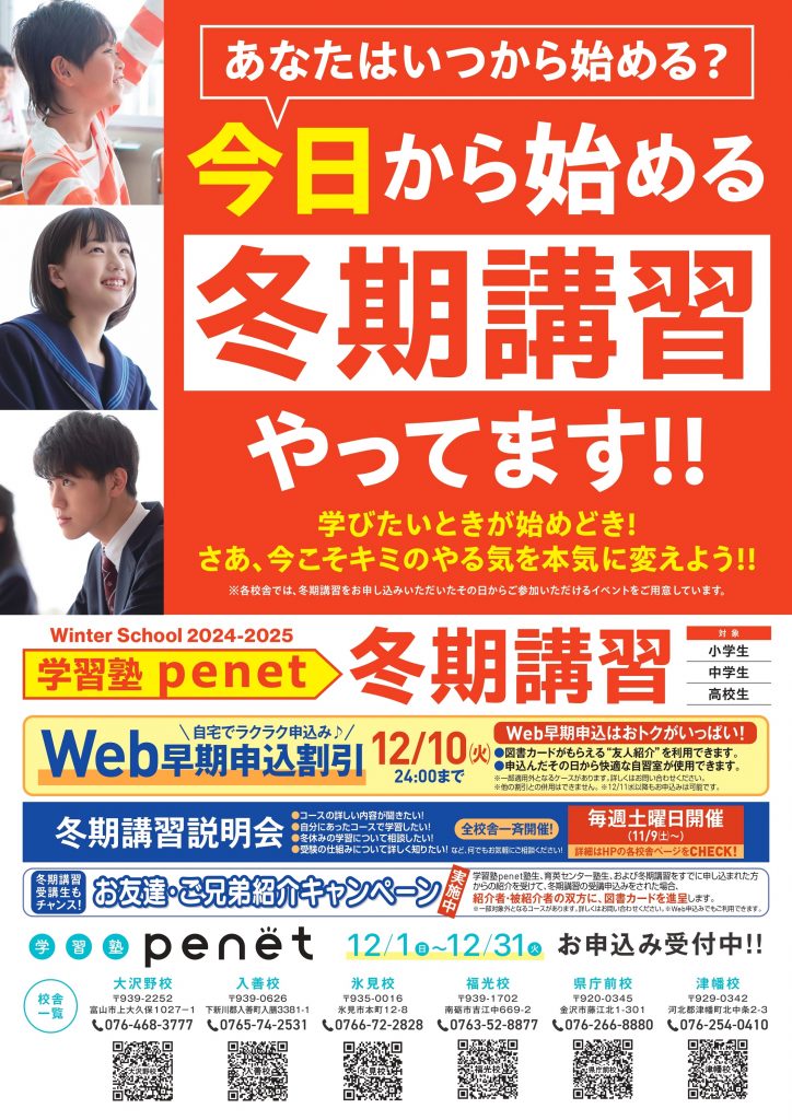 学習塾penet津幡校では、冬期講習の受付を開始しています。